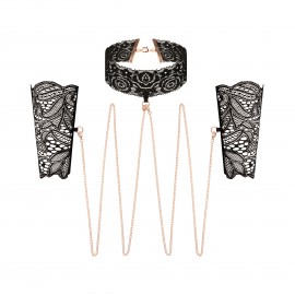Pensé pour un usage BDSM doux ou pour rehausser une tenue, cet ensemble peut être porté ensemble ou séparément. Les menottes offrent une contrainte légère, tandis que le collier ajoute une signature esthétique. Les chaînes reliant les éléments créent une cohésion visuelle et intime entre le cou et les poignets.