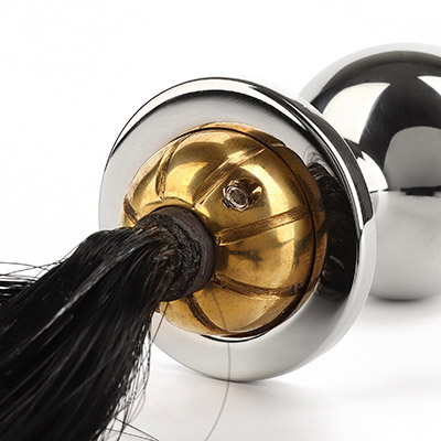 Le plug est fabriqué en acier inoxydable poli, offrant une sensation de poids et de fraîcheur incomparable. Sa surface lisse permet une insertion facile et confortable avec un lubrifiant adapté. L’embase est surmontée d’une coiffe dorée élégante où est fixée une queue de cheveux synthétiques noirs, rappelant avec sensualité les fantasmes les plus équins.